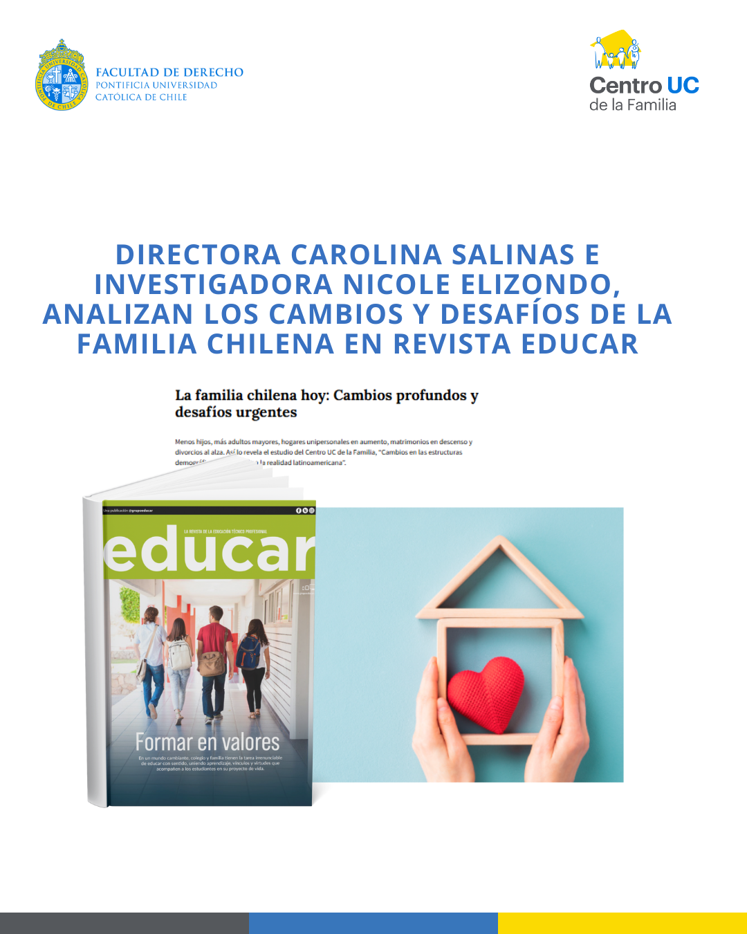 25 Septiembre 2025 Directora Carolina Salinas e investigadora Nicole Elizondo, analizan los cambios y desafíos de la familia chilena en Revista Educar 23 Septiembre 2025 Profesora y directora del Centro UC de la Familia, Carolina Salinas, realiza un balance sobre los 20 años de los tribunales de familia 12 Septiembre 2025 El Mercurio destaca seminario del Centro UC de la Familia sobre los 20 años de los tribunales de familia
